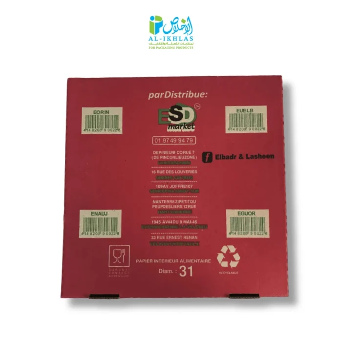 علب بيتزا كرتونية مستوردة بمقاس 31×31 سم، مصنوعة من خامات صديقة للبيئة وآمنة للطعام. تأتي في عبوة تحتوي على 100 قطعة بألوان متعددة، مناسبة للمطاعم وخدمات التوصيل .